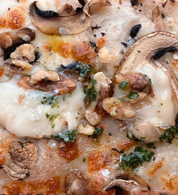 Na pizza semplice ma da paura: mozzarella che fila e funghi freschi, ‘n profumino che te fa venì l’acquolina...e infine er tocco della noce!